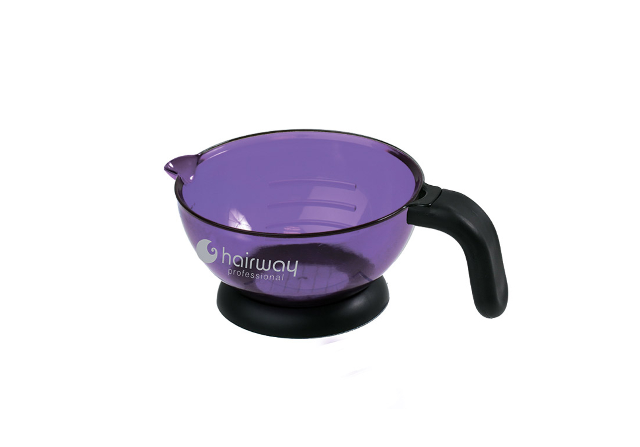 Пластиковая миска с ручкой и носиком Hairway 15212-09 фиолетового цвета для смешивание краски. Дно чаши покрыто резинкой против скольжения.Диаметр – 12.5 см.