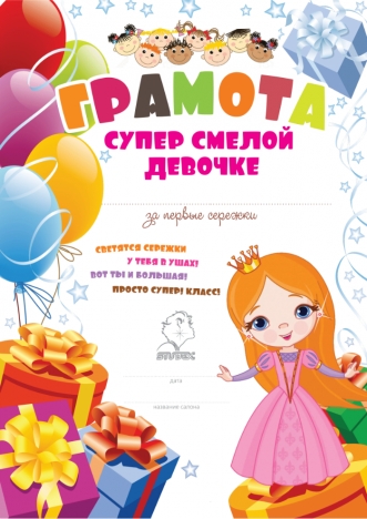 Грамота на память "Супер смелой девочке" Принцесса STUDEX